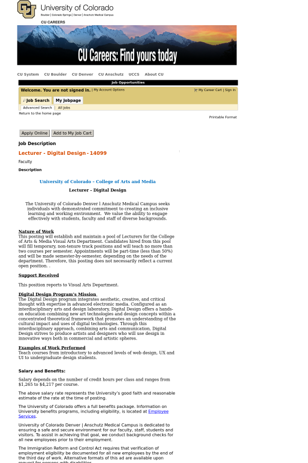 This posting will establish and maintain a pool of Lecturers for the College of Arts & Media Visual Arts Department. Candidates hired from this pool will fill temporary, non-tenure track positions and will teach no more than two courses per semester. Appointments will be part-time (less than 50%) and will be made semester-by-semester, depending on the needs of the department. Therefore, this posting does not necessarily reflect a current open position. .