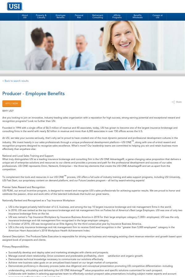 At USI, we take your success seriously, that’s why we’re proud to have created one of the most dynamic personal and professional development cultures in the industry. We invest heavily in our sales professionals through a unique professional development platform—USI ONE™, along with one-of-a-kind reward and recognition programs designed to recognize sales excellence. What’s more? Our leadership teams are committed to helping you win and retain business more effectively than anywhere else.