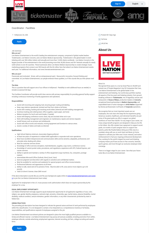 If the above description sounds like you and fits your background, apply online at www.livenationentertainment.com/careers to join the Live Nation Entertainment team today!