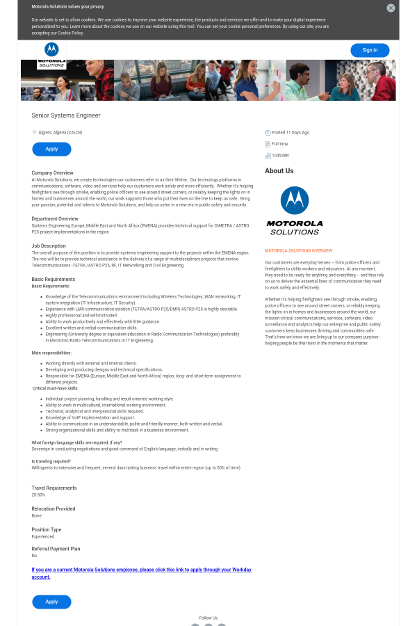 If you are a current Motorola Solutions employee, please click this link to apply through your Workday account.