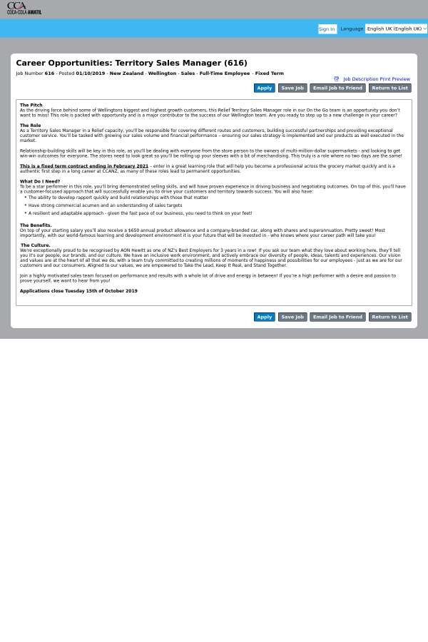 This is a fixed term contract ending in February 2021 – enter in a great learning role that will help you become a professional across the grocery market quickly and is a authentic first step in a long career at CCANZ, as many of these roles lead to permanent opportunities.