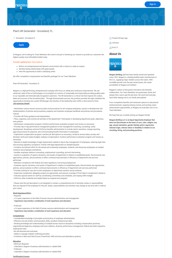 Niagara is a high-performing, entrepreneurial company with focus on safety and continuous improvement. We use advanced, state-of-the art technologies to accomplish our mission of sustainably and responsibly providing quality water to our reputable and internationally recognized customers. The HR Generalist is a critical role that impacts the culture, talent and success of the Groveland plant. Through demonstrated success, this position provides the right candidate the opportunity to develop into a plant HR Manager and member of the leadership team within a short period of time.