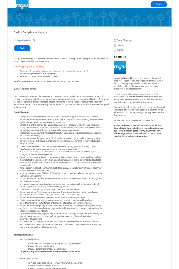 Employment agencies that have fee agreements with Niagara Bottling, LLC and have been engaged on a search shall submit résumé to the designated Niagara Bottling, LLC recruiter or, upon authorization, submit résumé into this career site to be eligible for placement fees.