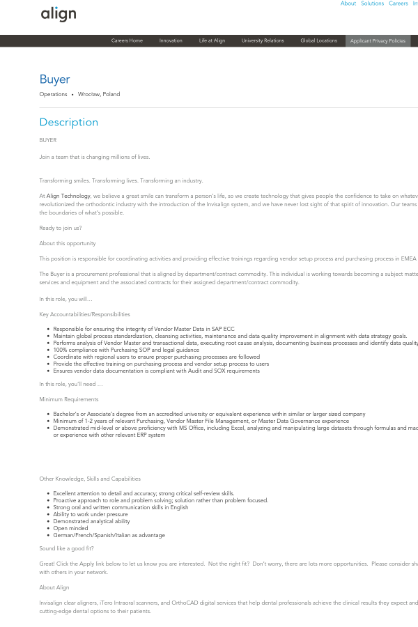 We are an equal opportunity employer. All applicants will be considered for employment without attention to race, color, religion, sex, sexual orientation, gender identity, national origin, veteran or disability status. We also respect your privacy. Our Applicant Privacy Policies can be found here: http://jobs.jobvite.com/align-tech/
