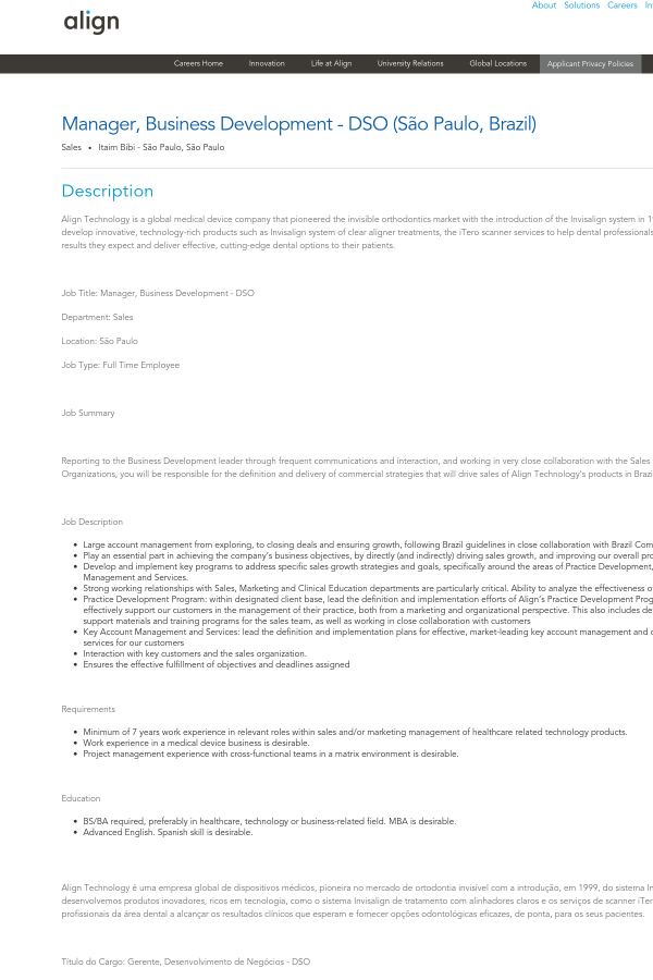 Reporting to the Business Development leader through frequent communications and interaction, and working in very close collaboration with the Sales and Marketing Organizations, you will be responsible for the definition and delivery of commercial strategies that will drive sales of Align Technology’s products in Brazil.