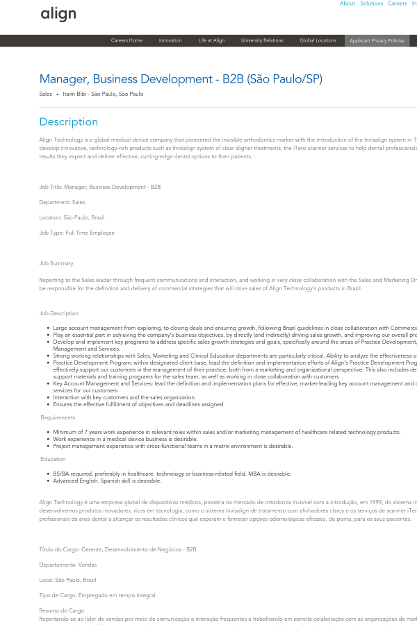 - Programa de Desenvolvimento de Práticas: dentro da base de clientes designada, liderar os esforços de definição e implementação do Programa de Desenvolvimento de Práticas da Align, projetado para apoiar efetivamente nossos clientes no gerenciamento de suas práticas, tanto da perspectiva de marketing, quanto organizacional. Isso também inclui a definição de materiais de suporte adequados e programas de treinamento para a equipe de vendas, além do trabalho em estreita colaboração com os clientes.