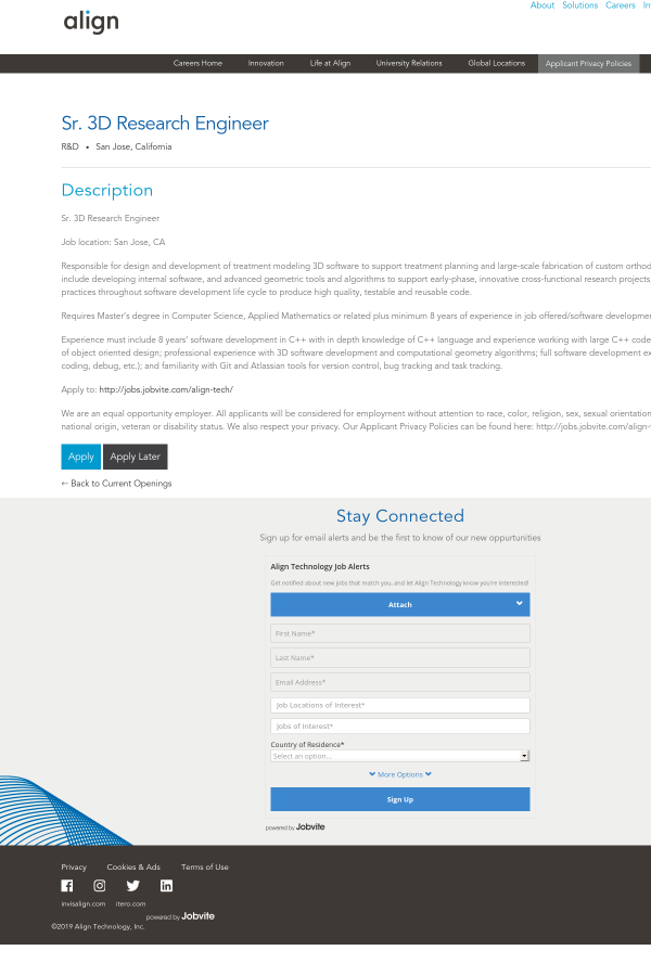 We are an equal opportunity employer. All applicants will be considered for employment without attention to race, color, religion, sex, sexual orientation, gender identity, national origin, veteran or disability status. We also respect your privacy. Our Applicant Privacy Policies can be found here: http://jobs.jobvite.com/align-tech/