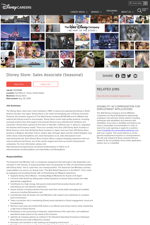 Disney Store USA, LLC is an equal opportunity employer. Applicants will receive consideration for employment without regard to race, color, religion, sex, national origin, sexual orientation, gender identity, disability or protected veteran status. Disney fosters a business culture where ideas and decisions from all people help us grow, innovate, create the best stories and be relevant in a rapidly changing world.