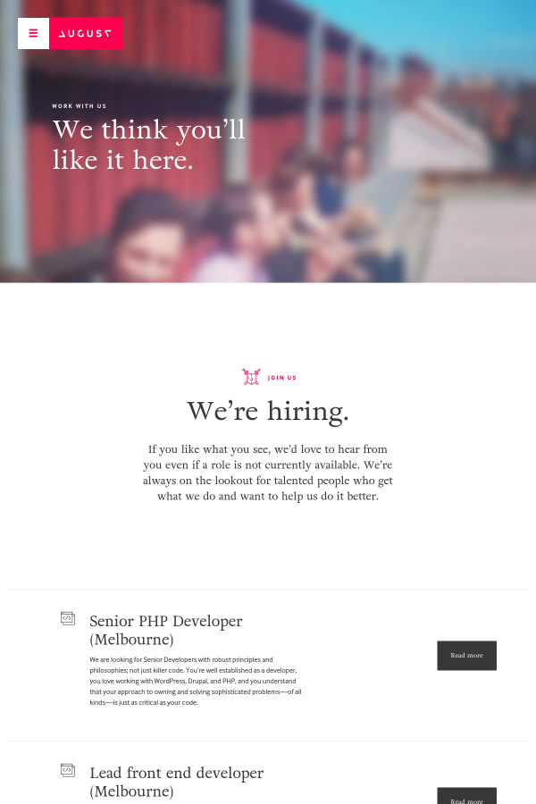 We are looking for Senior Developers with robust principles and philosophies; not just killer code. You’re well established as a developer, you love working with WordPress, Drupal, and PHP, and you understand that your approach to owning and solving sophisticated problems—of all kinds—is just as critical as your code. Read more Close We are looking for rounded developers with experience with working on WordPress websites within a LAMP stack environment. You have a solid understanding of the programming principles involved with such duties. Beyond that, you love being presented with sophisticated problems, taking ownership of the approach required to solve those problems, and working as part of a smart, well-trained and multi-disciplinary team to design and develop award-winning, meaningful work. The August team is smart and nimble; working together to build innovative applications, committed to learning and sharing something new every day, and known to own more than a few code-related t-shirts. PHP Developers work within our talented team to ensure that the work we produce today is better than what we put out yesterday. This is a great opportunity for bright, pragmatic and highly experienced PHP Developers to grow through collaborating with talented senior teams, while contributing to mentoring others. We are fixated on improving our clients’ outcomes and the experience for their audiences. We expect you to join us in our obsession. A creative, dynamic and fun work environment – while we take our work seriously, we really enjoy the company of the people we work with and we don’t take ourselves too seriously. You may notice spontaneous basketball playoffs, table-tennis matches, heaps of laughter around the office and a few fun surprises that we’ll tell you about on your first day. You will also get: Applications for this role are open now. To apply for this position, you need to: We understand you work in a competitive industry and you will be tempted to contact us with potential candidates for this and other listed roles. We respectfully request that you do not contact us regarding applicants for this role. August is an award-winning digital firm. We aim to nudge the world just enough to make a change. Help us to make it happen. Apply now