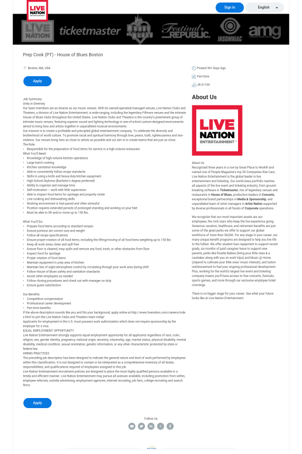 If the above description sounds like you and fits your background, apply online at http://www.livenation.com/careers/index.html to join the Live Nation Clubs and Theaters team today!