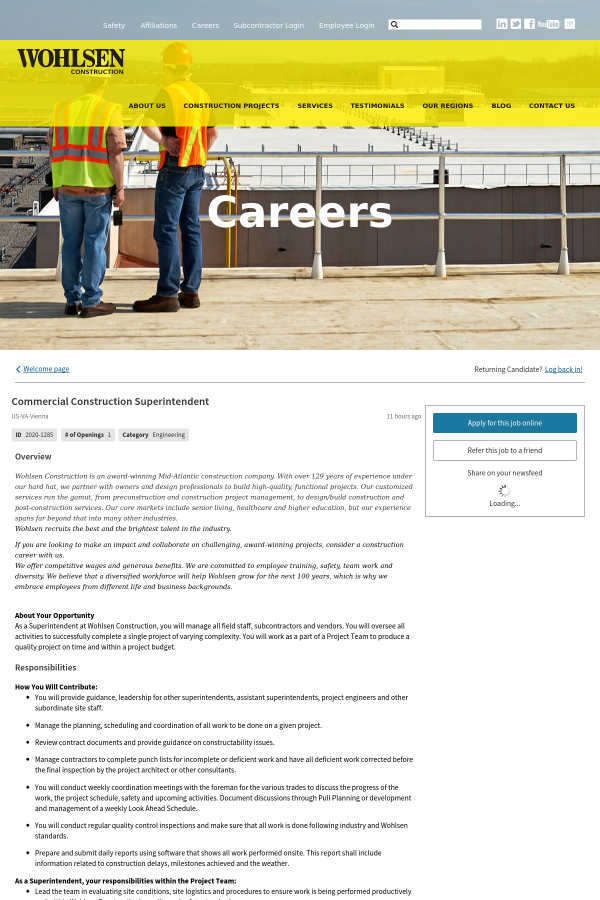 - Lead the team in evaluating site conditions, site logistics and procedures to ensure work is being performed productively and within Wohlsen Construction’s quality and safety standards.