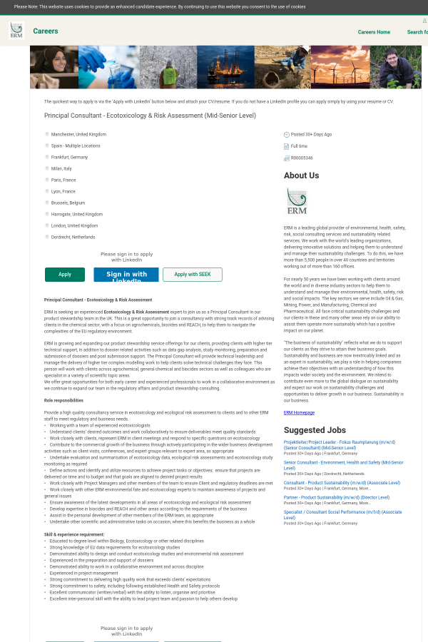 ERM is seeking an experienced Ecotoxicology & Risk Assessment expert to join us as a Principal Consultant in our product stewardship team in the UK. This is a great opportunity to join a consultancy with strong track records of advising clients in the chemical sector, with a focus on agrochemicals, biocides and REACH, to help them to navigate the complexities of the EU regulatory environment.