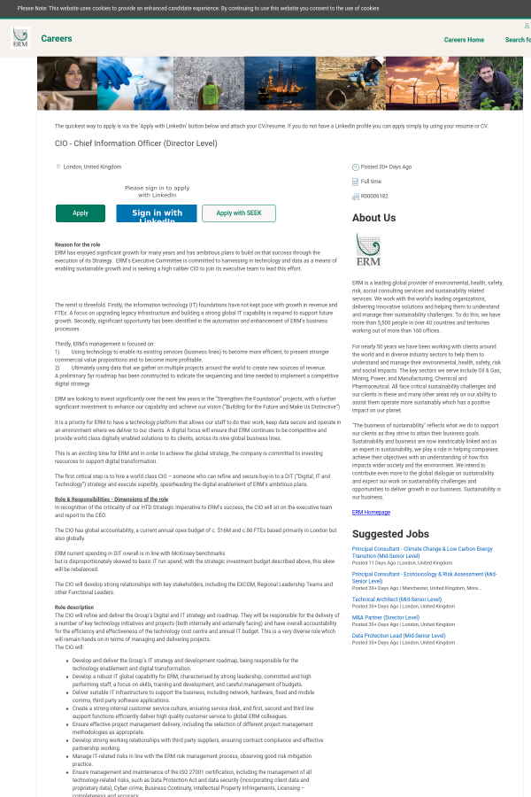 ERM has enjoyed significant growth for many years and has ambitious plans to build on that success through the execution of its Strategy. ERM’s Executive Committee is committed to harnessing in technology and data as a means of enabling sustainable growth and is seeking a high caliber CIO to join its executive team to lead this effort.