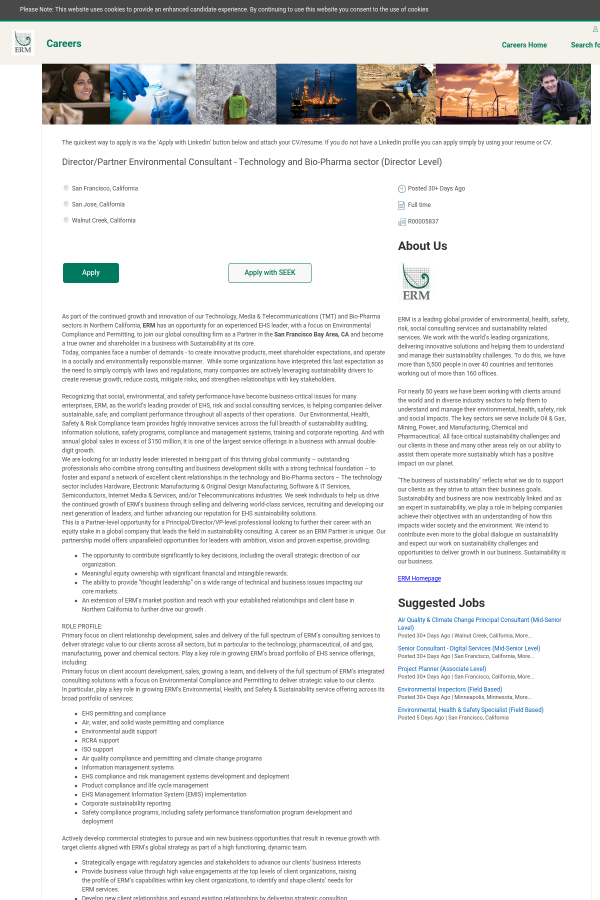 As part of the continued growth and innovation of our Technology, Media & Telecommunications (TMT) and Bio-Pharma sectors in Northern California, ERM has an opportunity for an experienced EHS leader, with a focus on Environmental Compliance and Permitting, to join our global consulting firm as a Partner in the San Francisco Bay Area, CA and become a true owner and shareholder in a business with Sustainability at its core.