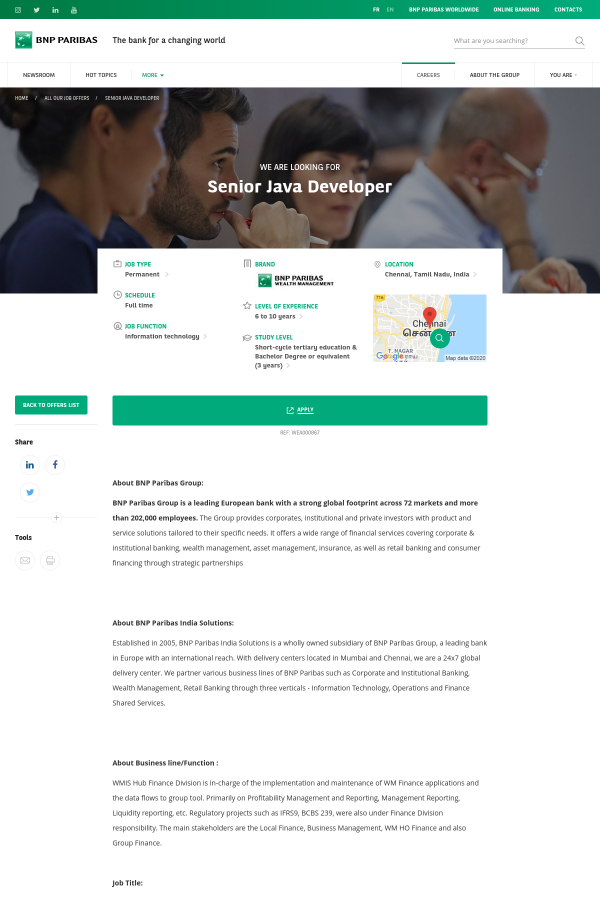 About BNP Paribas Group: BNP Paribas Group is a leading European bank with a strong global footprint across 72 markets and more than 202,000 employees. The Group provides corporates, institutional and private investors with product and service solutions tailored to their specific needs. It offers a wide range of financial services covering corporate & institutional banking, wealth management, asset management, insurance, as well as retail banking and consumer financing through strategic partnerships About BNP Paribas India Solutions: Established in 2005, BNP Paribas India Solutions is a wholly owned subsidiary of BNP Paribas Group, a leading bank in Europe with an international reach. With delivery centers located in Mumbai and Chennai, we are a 24x7 global delivery center. We partner various business lines of BNP Paribas such as Corporate and Institutional Banking, Wealth Management, Retail Banking through three verticals - Information Technology, Operations and Finance Shared Services. About Business line/Function : WMIS Hub Finance Division is in-charge of the implementation and maintenance of WM Finance applications and the data flows to group tool. Primarily on Profitability Management and Reporting, Management Reporting, Liquidity reporting, etc. Regulatory projects such as IFRS9, BCBS 239, were also under Finance Division responsibility. The main stakeholders are the Local Finance, Business Management, WM HO Finance and also Group Finance. Job Title: Technical Lead/ Senior Developer Date: 20/08/2019 Department: WMIS Hub Finance Division Location: Chennai Business Line / Function: WMIS COO Functions Reports to: (Direct) Grade: (if applicable) (Functional) Functional: - Number of Direct Reports: 5-6 Directorship / Registration: Position Purpose Finance in-house developed applications are using a mixed of technologies such as Oracle PL/SQL, Java and Business Objects. Many of the Oracle PL/SQL applications were legacy applications. We are looking for a suitable candidate to spear head the team on a road of digital transformation through identifying opportunities, provide and implement solutions for the transformation of these legacy applications with Java stack. This is a very important position as the candidate will be the key contact for all initiative in Finance Division that touches the Development Chapter. The Dev Chapter comprises of members with various technical skillsets. The person will be the Division main Java Tech Lead and DevOps SPOC. He will also play a key role in providing mentorship and guidance to the Dev Chapter members in Chennai, while working hands-on on projects implementation. Responsibilities • Lead a team efficiently to drive the project to completion. • Participate to the full development lifecycle including design, estimation, planning, development, unit test, release and implementation support. • Work with the Business Analyst and Solution architects to understand the business requirements and translate them to technical solutions in the application. • Contribute / review the technical specifications. • Responsible for managing & reporting technical risks. • Control and Maintain the quality of the developments (norms & standards, frameworks, source control, technical reviews, code reviews) • Provide guidance to team members. • Participate to recruitment, onboard and train new comers. Technical & Behavioral Competencies • Hands-on experience with various Java / Web technologies and frameworks: Spring (Core, Security, MVC), JPA, REST API, JMS • Hands-on experience with Oracle PL/SQL. • Hands-on experience as Tech Leader, coaching team members and leading the building and delivery of Web / Mobile solutions. • Hands-on experience on API related activities: requirement analysis, design, resource based API modeling, micro-services architecture. • Hands-on experience on User Interface development. Either Angular 5.x or React. • Mentor a team and work with groups effectively. • Strong knowledge about design patterns and development principles. • Good practical knowledge of design of RDBMS and SQL. • Strong critical thinker with problem solving aptitude. • Excellent written and oral communication skills. • Experience and knowledge of automated testing (TDD, BDD). • Proven/previous experience with CI/CD, DevOps and Agile. • General banking knowledge or Banking knowledge related to Wealth Management / Private banking. • Preferably experienced with Micro-services, Docker. Specific Qualifications (if required) Java / Web Technologies and Frameworks Spring (Core, Security and MVC) JPA REST API JMS PL/SQL Angular 5.x Skills Referential Behavioural Skills : (Please select up to 4 skills) Communication skills - oral & written Critical thinking Ability to share / pass on knowledge Ability to deliver / Results driven Transversal Skills: (Please select up to 5 skills) Ability to understand, explain and support change Ability to develop and adapt a process Ability to develop others & improve their skills Ability to anticipate business / strategic evolution Ability to manage a project Education Level: Bachelor Degree or equivalent Experience Level At least 10 years Other/Specific Qualifications (if required) • Speaking at conferences and/or user groups • Contributing to open source projects • Java script development (Node.js or SPA framework) • NoSQL experience • Exposure to Enterprise Architecture Position Purpose Finance in-house developed applications are using a mixed of technologies such as Oracle PL/SQL, Java and Business Objects. Many of the Oracle PL/SQL applications were legacy applications. We are looking for a suitable candidate to spear head the team on a road of digital transformation through identifying opportunities, provide and implement solutions for the transformation of these legacy applications with Java stack. This is a very important position as the candidate will be the key contact for all initiative 