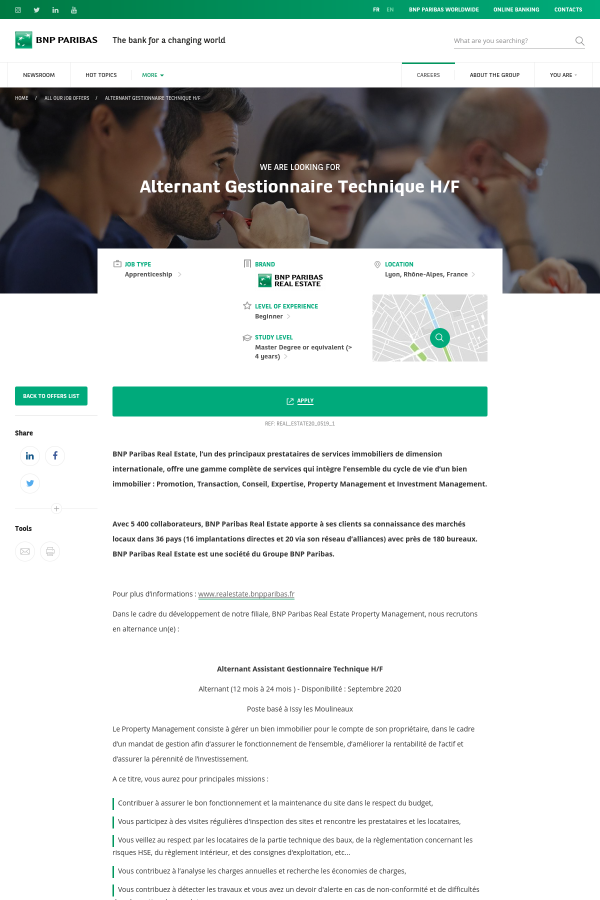 BNP Paribas Real Estate, l’un des principaux prestataires de services immobiliers de dimension internationale, offre une gamme complète de services qui intègre l’ensemble du cycle de vie d’un bien immobilier : Promotion, Transaction, Conseil, Expertise, Property Management et Investment Management. Avec 5 400 collaborateurs, BNP Paribas Real Estate apporte à ses clients sa connaissance des marchés locaux dans 36 pays (16 implantations directes et 20 via son réseau d’alliances) avec près de 180 bureaux. BNP Paribas Real Estate est une société du Groupe BNP Paribas. Pour plus d’informations : www.realestate.bnpparibas.fr Dans le cadre du développement de notre filiale, BNP Paribas Real Estate Property Management, nous recrutons en alternance un(e) : Alternant Assistant Gestionnaire Technique H/F Alternant (12 mois à 24 mois ) - Disponibilité : Septembre 2020 Poste basé à Issy les Moulineaux Le Property Management consiste à gérer un bien immobilier pour le compte de son propriétaire, dans le cadre d’un mandat de gestion afin d’assurer le fonctionnement de l’ensemble, d’améliorer la rentabilité de l’actif et d’assurer la pérennité de l’investissement. A ce titre, vous aurez pour principales missions : Contribuer à assurer le bon fonctionnement et la maintenance du site dans le respect du budget, Vous participez à des visites régulières d'inspection des sites et rencontre les prestataires et les locataires, Vous veillez au respect par les locataires de la partie technique des baux, de la règlementation concernant les risques HSE, du règlement intérieur, et des consignes d'exploitation, etc... Vous contribuez à l’analyse les charges annuelles et recherche les économies de charges, Vous contribuez à détecter les travaux et vous avez un devoir d'alerte en cas de non-conformité et de difficultés dans la gestion du mandat, Vous participez au suivi des appels d’offres, du suivi des travaux et des sinistres (Dommages-ouvrages, garantie parfait-achèvement…), Vous participez à établir les reportings de l'état technique des immeubles à sa hiérarchie et au mandant, Vous collaborez à la veille de la conformité des immeubles par rapport à la règlementation technique, Vous assurez l'accompagnement de la démarche environnementale. Environnement de travail Rattaché(e) au Gestionnaire Technique, vous participer à assurer le suivi technique des mandats composant votre portefeuille et mettez en œuvre l’ensemble des moyens permettant de maintenir et d’améliorer la rentabilité de ce patrimoine . Vous mettez en place les actions définies par la Direction Technique dans le cadre de la politique de gestion des risques. Apport de la mission Riche en découvertes et polyvalence, cette mission vous permettra de développer votre connaissance des marchés immobiliers, ainsi que vos capacités à travailler sur des sujets concrets et responsabilisants. Profil recherché De formation supérieure type Master spécialisé en immobilier, vous êtes à la recherche d’un contrat en alternance, qui vous permettra de mettre en pratique vos acquis académiques. Vous avez une bonne maîtrise des technologies et pathologies du bâtiment, des techniques de maintenance multisites, de solides connaissances règlementaires dans le domaine de la gestion immobilière. De plus, vous maîtrisez l’élaboration des budgets prévisionnels travaux, et détenez une bonne maîtrise des outils bureautiques. La pratique de l'anglais est un plus. Compétences comportementales nécessaires au poste Rigueur et précision, Capacité d’organisation, Capacité d’adaptation, Capacité à communiquer, Sens des situations, Echangez avec nos Ambassadeurs pour tout savoir de leur quotidien et environnements de travail