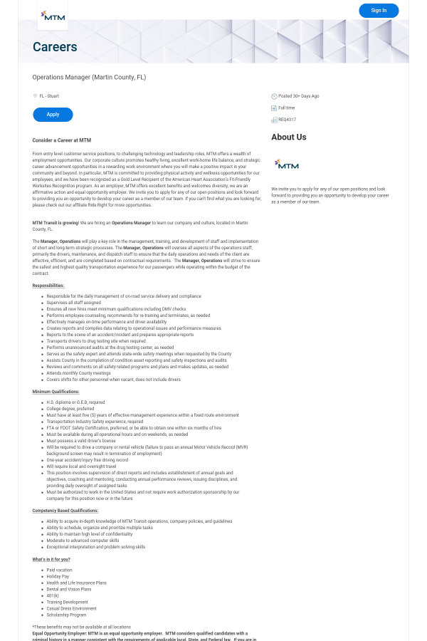 MTM Transit is growing! We are hiring an Operations Manager to learn our company and culture, located in Martin County, FL.