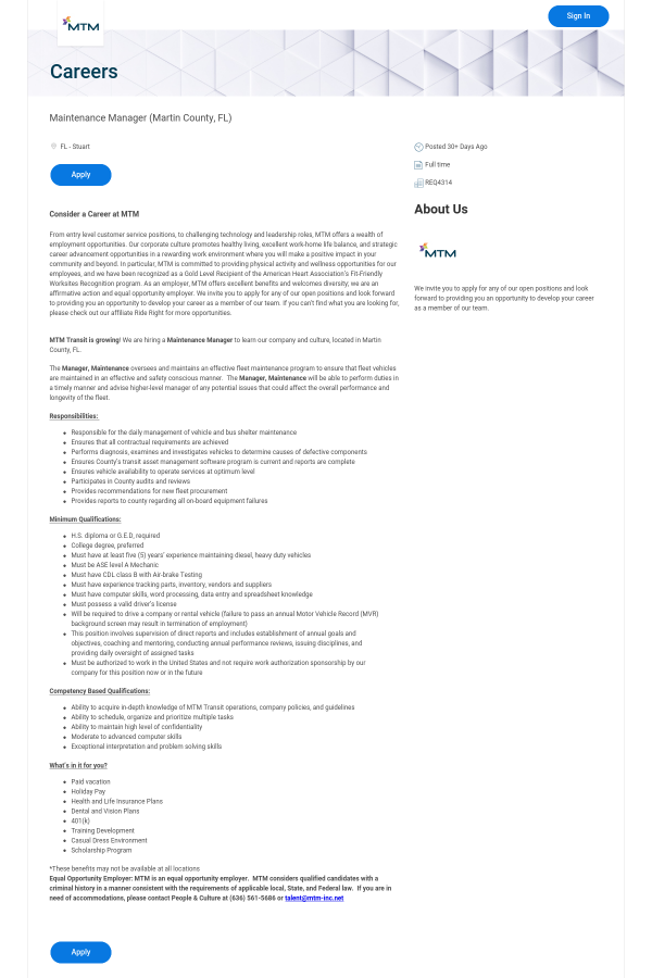 MTM Transit is growing! We are hiring a Maintenance Manager to learn our company and culture, located in Martin County, FL.