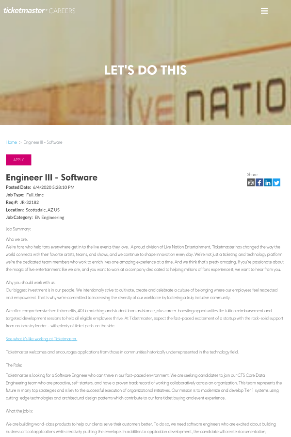 Ticketmaster welcomes and encourages applications from those in communities historically underrepresented in the technology field.