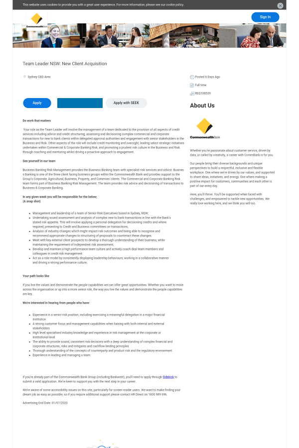 If you're already part of the Commonwealth Bank Group (including Bankwest), you'll need to apply through Sidekick to submit a valid application. We’re keen to support you with the next step in your career.