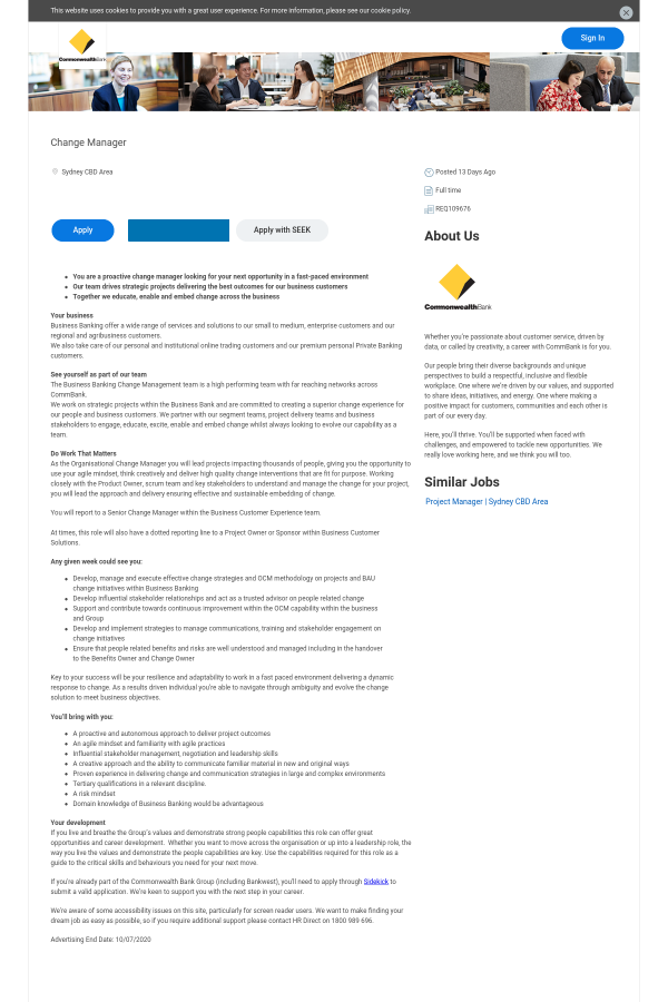 If you're already part of the Commonwealth Bank Group (including Bankwest), you'll need to apply through Sidekick to submit a valid application. We’re keen to support you with the next step in your career.