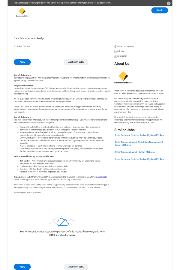 We're aware of some accessibility issues on this site, particularly for screen reader users. We want to make finding your dream job as easy as possible, so if you require additional support please contact HR Direct on 1800 989 696.