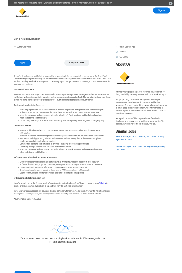 We're aware of some accessibility issues on this site, particularly for screen reader users. We want to make finding your dream job as easy as possible, so if you require additional support please contact HR Direct on 1800 989 696.