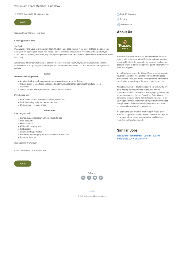 When you join Panera LLC as a Restaurant Team Member – Line Cook, you join in our belief that food should not only taste good, but also be good for you. You will be a part of something special where you will have the opportunity to connect with our amazing customers, impact our growing business, and most importantly serve local communities across the country.