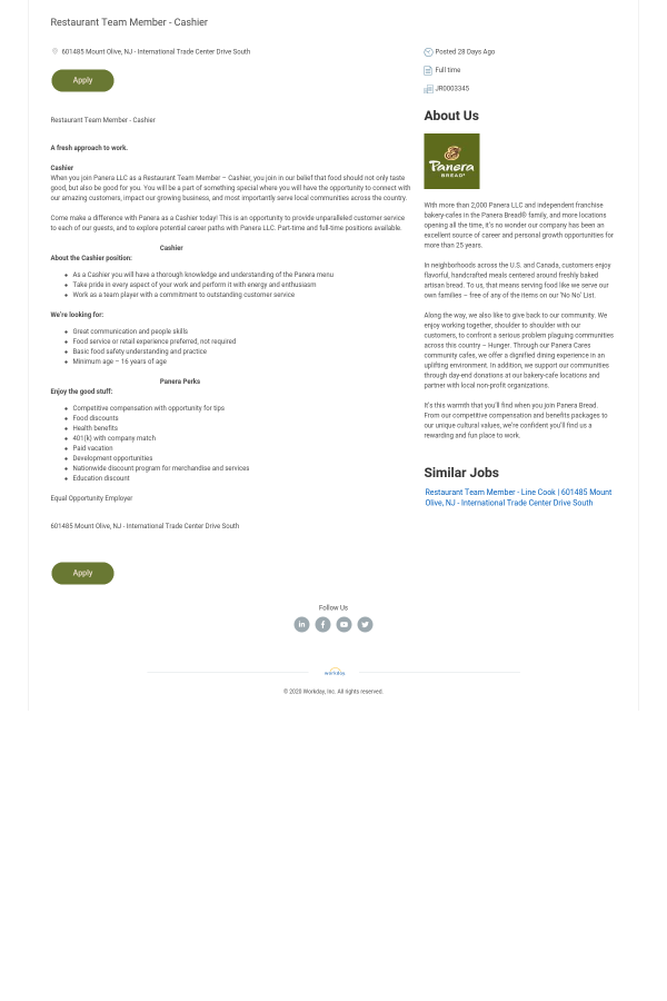 When you join Panera LLC as a Restaurant Team Member – Cashier, you join in our belief that food should not only taste good, but also be good for you. You will be a part of something special where you will have the opportunity to connect with our amazing customers, impact our growing business, and most importantly serve local communities across the country.