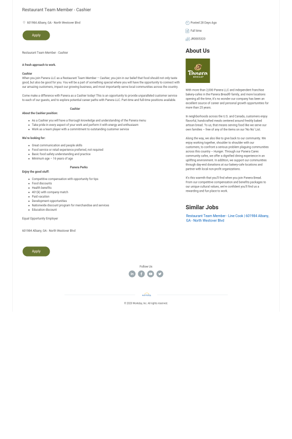 When you join Panera LLC as a Restaurant Team Member – Cashier, you join in our belief that food should not only taste good, but also be good for you. You will be a part of something special where you will have the opportunity to connect with our amazing customers, impact our growing business, and most importantly serve local communities across the country.