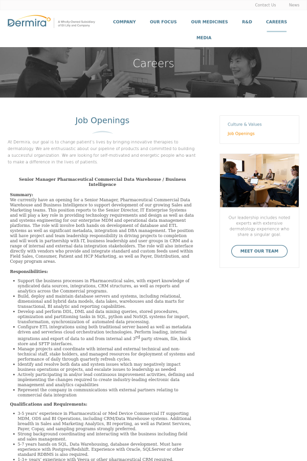 - 3-5 years’ experience in Pharmaceutical or Med Device Commercial IT supporting MDM, ODS and BI Operations, including CRM/Data Warehouse systems. Additional breadth in Sales and Marketing Analytics, BI reporting, as well as Patient Services, Payer, Copay, and sampling programs strongly preferred.