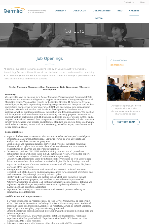 - 3-5 years’ experience in Pharmaceutical or Med Device Commercial IT supporting MDM, ODS and BI Operations, including CRM/Data Warehouse systems. Additional breadth in Sales and Marketing Analytics, BI reporting, as well as Patient Services, Payer, Copay, and sampling programs strongly preferred.
