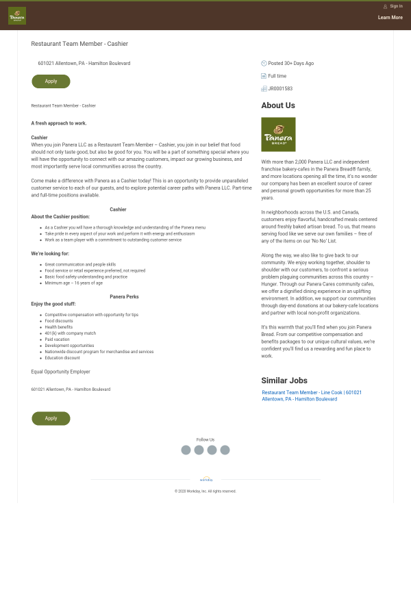 When you join Panera LLC as a Restaurant Team Member – Cashier, you join in our belief that food should not only taste good, but also be good for you. You will be a part of something special where you will have the opportunity to connect with our amazing customers, impact our growing business, and most importantly serve local communities across the country.