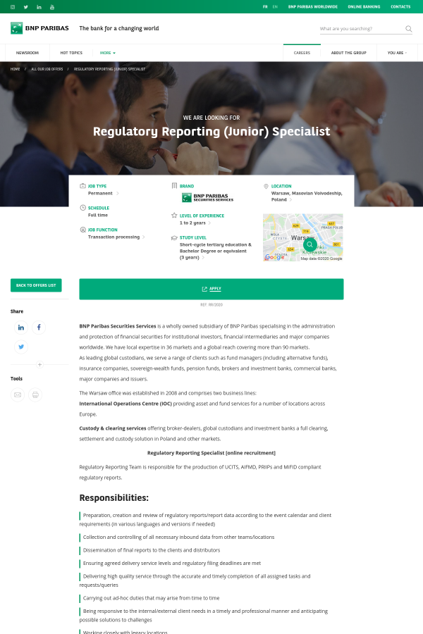 BNP Paribas Securities Services is a wholly owned subsidiary of BNP Paribas specialising in the administration and protection of financial securities for institutional investors, financial intermediaries and major companies worldwide. We have local expertise in 36 markets and a global reach covering more than 90 markets. As leading global custodians, we serve a range of clients such as fund managers (including alternative funds), insurance companies, sovereign-wealth funds, pension funds, brokers and investment banks, commercial banks, major companies and issuers. The Warsaw office was established in 2008 and comprises two business lines: International Operations Centre (IOC) providing asset and fund services for a number of locations across Europe. Custody & clearing services offering broker-dealers, global custodians and investment banks a full clearing, settlement and custody solution in Poland and other markets. Regulatory Reporting Specialist [online recruitment] Regulatory Reporting Team is responsible for the production of UCITS, AIFMD, PRIIPs and MiFID compliant regulatory reports. Responsibilities: Preparation, creation and review of regulatory reports/report data according to the event calendar and client requirements (in various languages and versions if needed) Collection and controlling of all necessary inbound data from other teams/locations Dissemination of final reports to the clients and distributors Ensuring agreed delivery service levels and regulatory filing deadlines are met Delivering high quality service through the accurate and timely completion of all assigned tasks and requests/queries Carrying out ad-hoc duties that may arise from time to time Being responsive to the internal/external client needs in a timely and professional manner and anticipating possible solutions to challenges Working closely with legacy locations Working closely with other teams participating in the process Liaising with Clients Proactively seeking to identify and improve current procedures/service delivery Ensuring the archiving process for all the necessary documents is followed Contributing to the development of the Regulatory Reporting infrastructure necessary to support and control business growth Keeping abreast of the changing needs of the industry and keeping up with current regulatory environment Ensuring client reporting metrics are delivered to add value to client service levels Training and support of new employees Fluency in English and French Good MS Office skills, in particular Excel W illingness to learn about reporting requirements under UCITS, AIFMD, PRIIPs and MiFID Good knowledge of different types of Financial Instruments Experience working in Fund Accounting or Regulatory Reporting would be an asset Good analysis and problem-solving skills with a strong attention to detail Ability to work within a team Highly organized and able to meet deadlines Excellent communication and interpersonal skills Skills required: We're looking for both experienced specialist and juniors starting their professional career. The level of the position will be adjusted individually basing on candidates’ professional experience Our offer: Stable employment on the basis of full-time job contract Supportive and friendly work environment with many opportunities to integrate with work colleagues (tennis school, football league, volleyball and basketball classes, integration weekends, etc.) Wide range of trainings: soft skills, professional competences, technical trainings and financial knowledge trainings Opportunities to grow within the organization including 6 Career Paths to choose from Attractive benefits package Convenient work location near Rondo Daszyńskiego BNP Paribas promotes equality of opportunity and is committed to ensuring that no individual is discriminated against on the grounds of age, disability, gender reassignment, marriage or civil partnership status, pregnancy and maternity, race, religion or belief, sex or sexual orientation. Please attach the below clause to your application: I hereby give consent for my personal data included in my application to be processed for the purposes of the recruitment process under the Regulation (EU) 2016/679 of the European Parliament and of the Council of 27 April 2016 on the protection of natural persons with regard to the processing of personal data and on the free movement of such data, and repealing Directive 95/46/EC (General Data Protection Regulation) introduced into the Polish law with Data Protection Act of 10 May 2018 (Dz. U. 2018 poz.1000 as amended). I acknowledge that I have the right at any time to view, to amend or correct and to request to erase my personal data.
