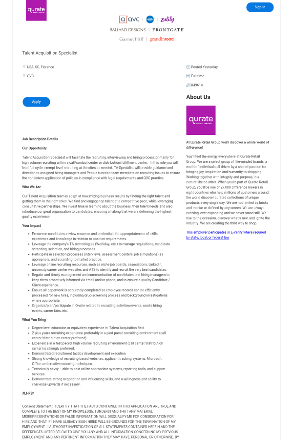 Talent Acquisition Specialist will facilitate the recruiting, interviewing and hiring process primarily for high volume recruiting within a call/contact center or distribution/fulfillment center. In this role you will lead full-cycle exempt level recruiting at the sites as needed. TA Specialist will provide guidance and direction to assigned hiring managers and People function team members on recruiting issues to ensure the consistent application of policies in compliance with legal requirements and QVC practice.