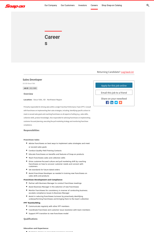 - Equivalent internal experience would be 4 years within Snap-on organization and acquisition of strong product knowledge