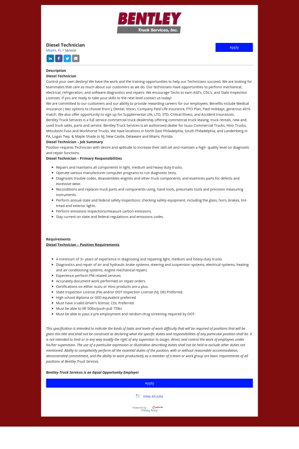 Bentley Truck Services is an Equal Opportunity Employer