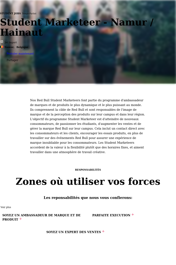 Nos Red Bull Student Marketeers font partie du programme d'ambassadeur de marques et de produits le plus dynamique et le plus puissant au monde. Ils comprennent la cible de Red Bull et sont responsables de l'image de marque et de la perception des produits sur leur campus et dans leur région. L'objectif du programme Student Marketeer est d'atteindre de nouveaux consommateurs, de passionner les étudiants, d'augmenter les ventes et de gérer la marque Red Bull sur leur campus. Cela inclut un contact direct avec les consommateurs et les clients, encourager les essais produits, en plus de travailler sur des événements Red Bull pour assurer une expérience de marque inoubliable pour les consommateurs. Les Student Marketeers accordent de la valeur à la flexibilité plutôt que des horaires fixes, et aiment travailler dans une atmosphère de travail créative.