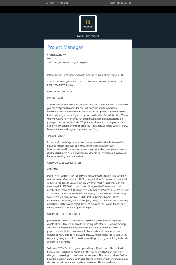 At Martin Horn, you’ll be learning from talented, smart people at a company you can feel proud to work for. You will have the ability to work on interesting and innovative landmarks and historic projects. You will also be building during a time of dynamic growth in the city of Charlottesville. When you work at Martin Horn, you have opportunities to gain knowledge and grow your skills on and off site. We put a lot of trust in our employees and give them ownership over their projects. This is a place where you can grow, learn, and create a long-lasting career that fits you.