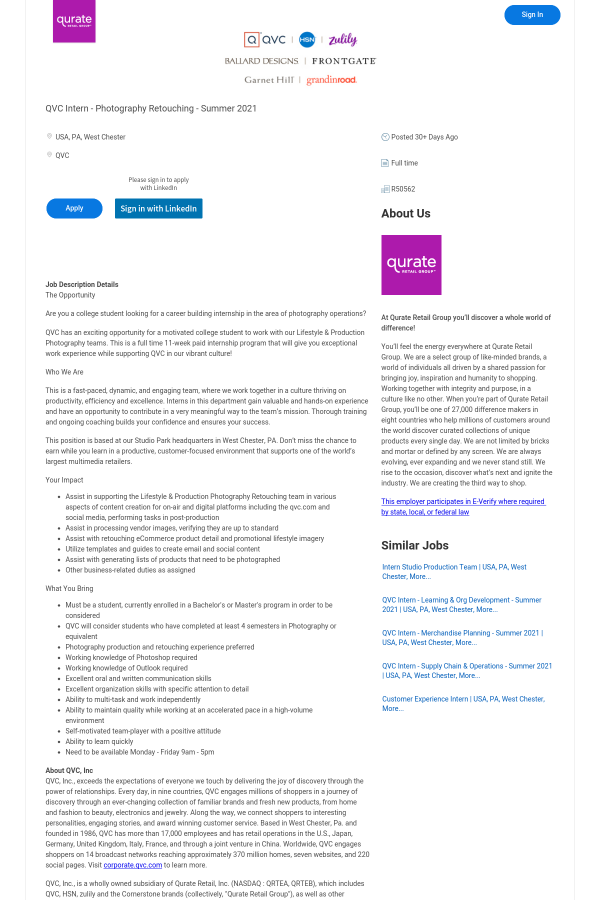 QVC has an exciting opportunity for a motivated college student to work with our Lifestyle & Production Photography teams. This is a full time 11-week paid internship program that will give you exceptional work experience while supporting QVC in our vibrant culture!