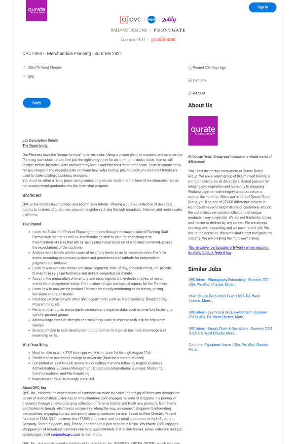 As an equal opportunity employer, Qurate Retail Group is committed to a diverse workforce and is also committed to a barrier-free employment process. In order to ensure reasonable accommodations for individuals pursuant to applicable law, individuals that require accommodation in the job application process for a posted position may contact us at CareersUS@QVC.com for assistance.