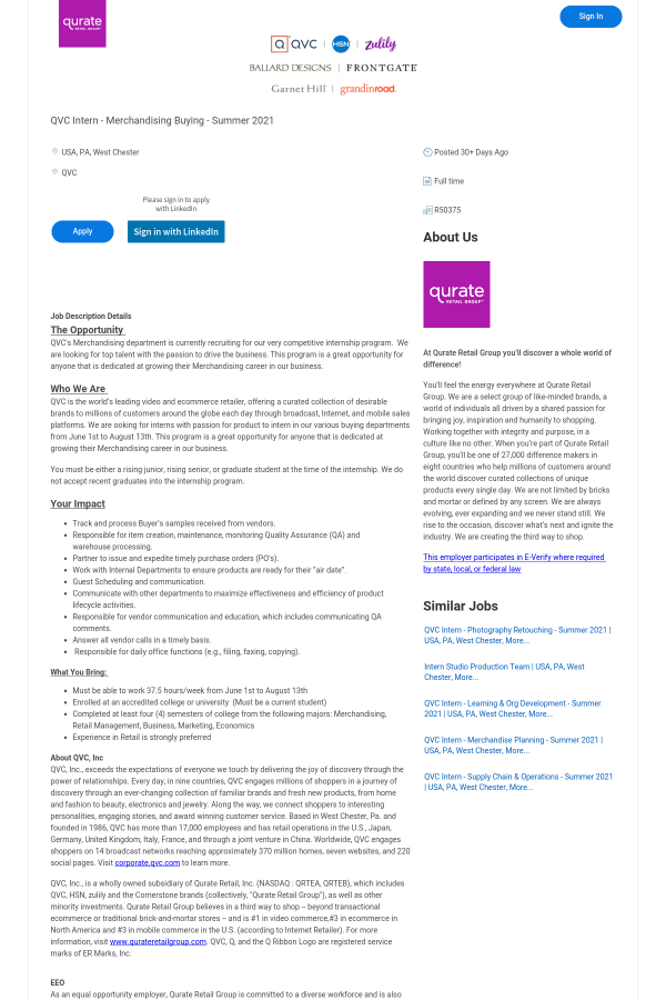 QVC is the world’s leading video and ecommerce retailer, offering a curated collection of desirable brands to millions of customers around the globe each day through broadcast, Internet, and mobile sales platforms. We are ooking for interns with passion for product to intern in our various buying departments from June 1st to August 13th. This program is a great opportunity for anyone that is dedicated at growing their Merchandising career in our business.