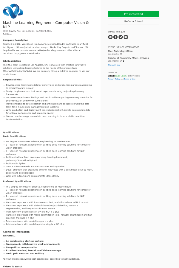 The R&D team (located in Los Angeles, CA) is involved with creating innovative solutions using deep learning tailored to the needs of the product lines (Thorax/Retina/Cardio/Skin). We are currently hiring a full-time engineer to join our model team.