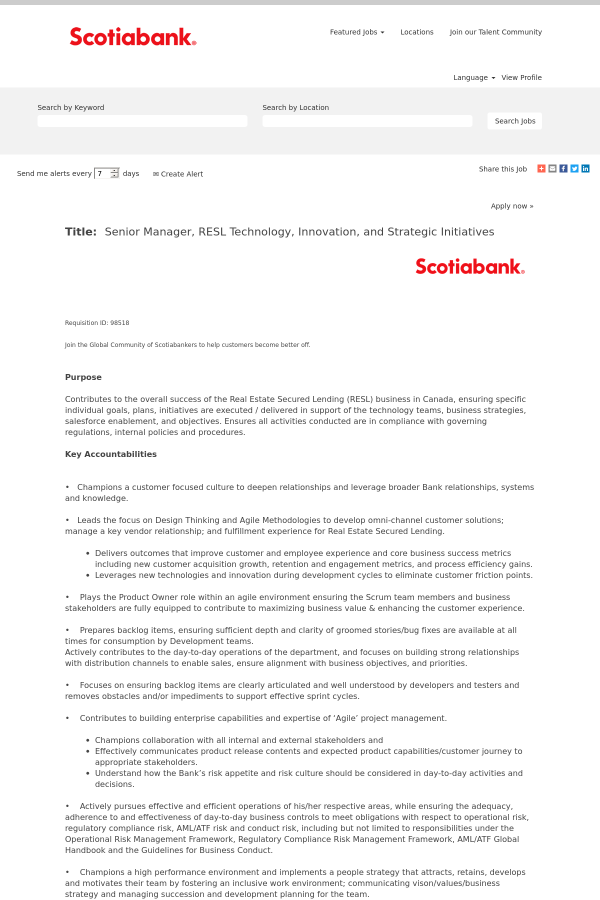 At Scotiabank, we value the unique skills and experiences each individual brings to the Bank, and are committed to creating and maintaining an inclusive and accessible environment for everyone. If you require accommodation (including, but not limited to, an accessible interview site, alternate format documents, ASL Interpreter, or Assistive Technology) during the recruitment and selection process, please let our Recruitment team know. If you require technical assistance, please click here. Candidates must apply directly online to be considered for this role. We thank all applicants for their interest in a career at Scotiabank; however, only those candidates who are selected for an interview will be contacted.
