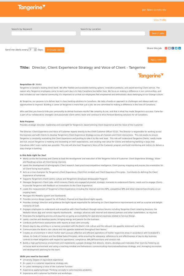 - Acts as a true champion for Tangerine’s Client Experience, Client-first mindset and Client Experience Principles. Contributes to defining the Client Experience of tomorrow.