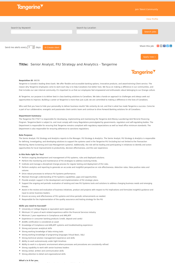 The Senior Analyst, FIU Strategy and Analytics reports to the Manager, FIU Strategy & Analytics. The Senior Analyst, FIU Strategy & Analytics is responsible for defining, investigating, and developing solutions to support the systems used in the Tangerine FIU (including but not limited to the Transaction Monitoring, Name Screening and Case Management systems). Additionally, the role will be leading and participating in initiatives to identify and action opportunities for local improvements to productivity, decision effectiveness, and the user experience.