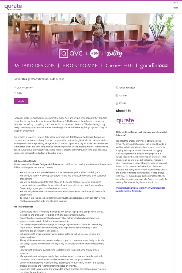 We are looking for a Senior Designer/Art Director, who will lead and develop visually compelling work for Zulily’s retail experiences across channels.