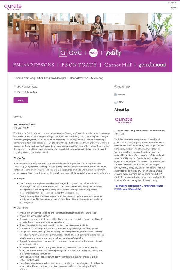 This is the perfect time to join our team as we are transforming our Talent Acquisition team in creating a specialized focus in Global Programming at Qurate Retail Group (QRG). The Global Program Manager supporting Employment Brand & Recruitment Marketing will be responsible for setting the strategic framework and direction across all of Qurate Retail Group. In this forward-thinking role, you will have a passion for digital media and will spend time future gazing about the future of how job seekers look for their next career and then how that can translate into digital and marketing initiatives attracting and engaging top talent around the world.
