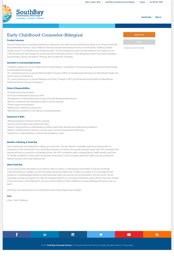 Do you want to work with leaders in your field to make an impact in underserved communities? Come join South Bay Community Services, a leader in community-based, behavioral health care. At SBCS, our mission is to encourage the self-sufficiency of disadvantaged people through behavioral health care services that are grounded in the community. We are constantly evolving our programs to meet the changing needs of our consumers. We believe, above all else, that every member of the community is worth fighting for. We are currently looking for Early Childhood Counselor-Bilingual Clinicians to join our team!