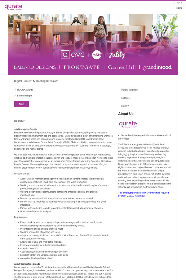 Headquartered in exciting Atlanta, Georgia, Ballard Designs is a dynamic, fast-growing marketer of globally inspired home furnishings and accessories. Ballard Designs is a part of Cornerstone Brands, a family of leading home and apparel brands including Frontgate, Garnet Hill, and Grandin Road Cornerstone is a division of Qurate Retail Group (NASDAQ: QRG), a $14 billion interactive multi-channel retailer that offers an innovative, differentiated retail experience on TV, online, via mobile, in catalogs, and in brick and mortar stores.